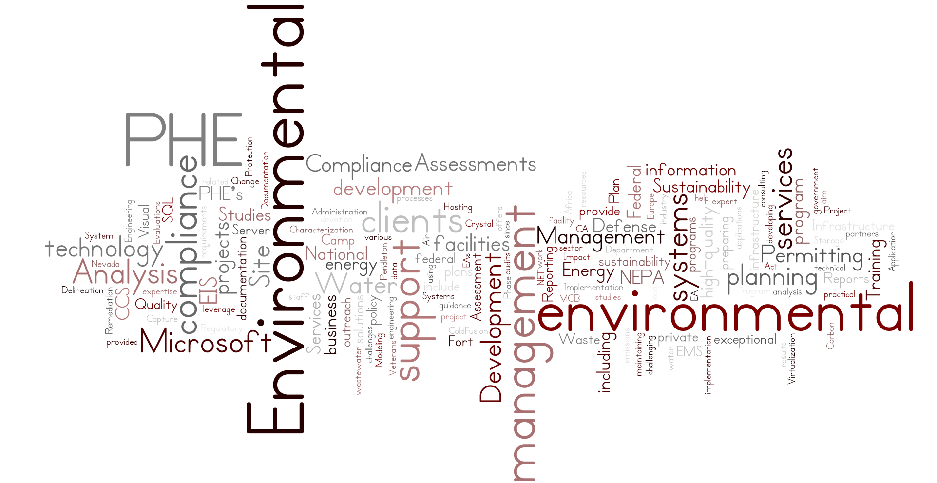 PHE is an innovative environmental, planning, and technology consulting firm. Our engineers, scientists, and planners are engaged in complex programs and projects solving today’s most pressing environmental, climate change, energy, and national security challenges. Since our founding in 1988, we have earned a reputation as a provider of responsive, cost-effective, and high-quality services to Federal and private sector clients. PHE leverages staff expertise, a broad network of industry and government partners, and value-adding information technology to consistently produce exceptional results in the following service areas: